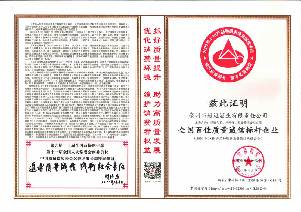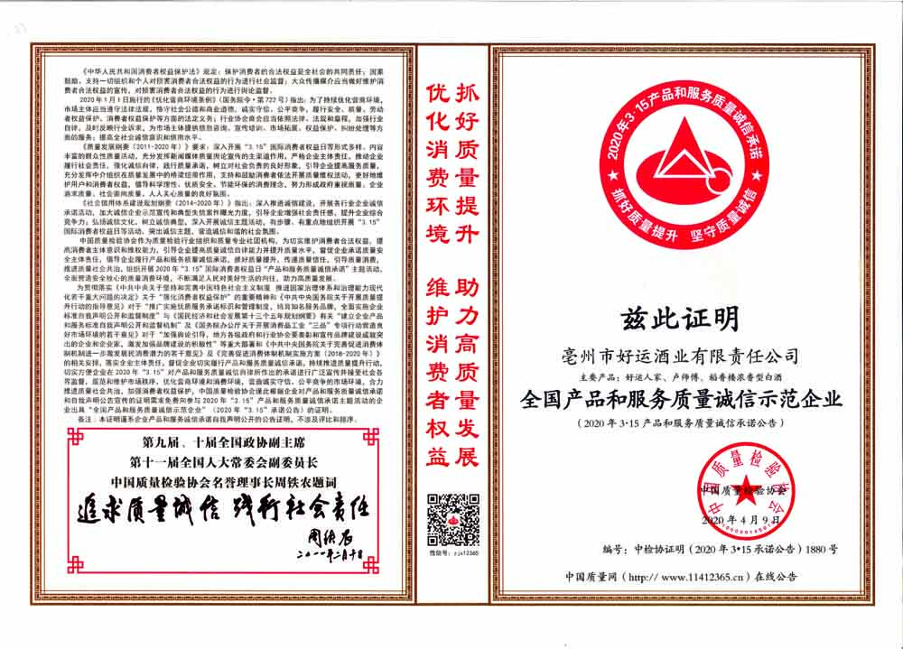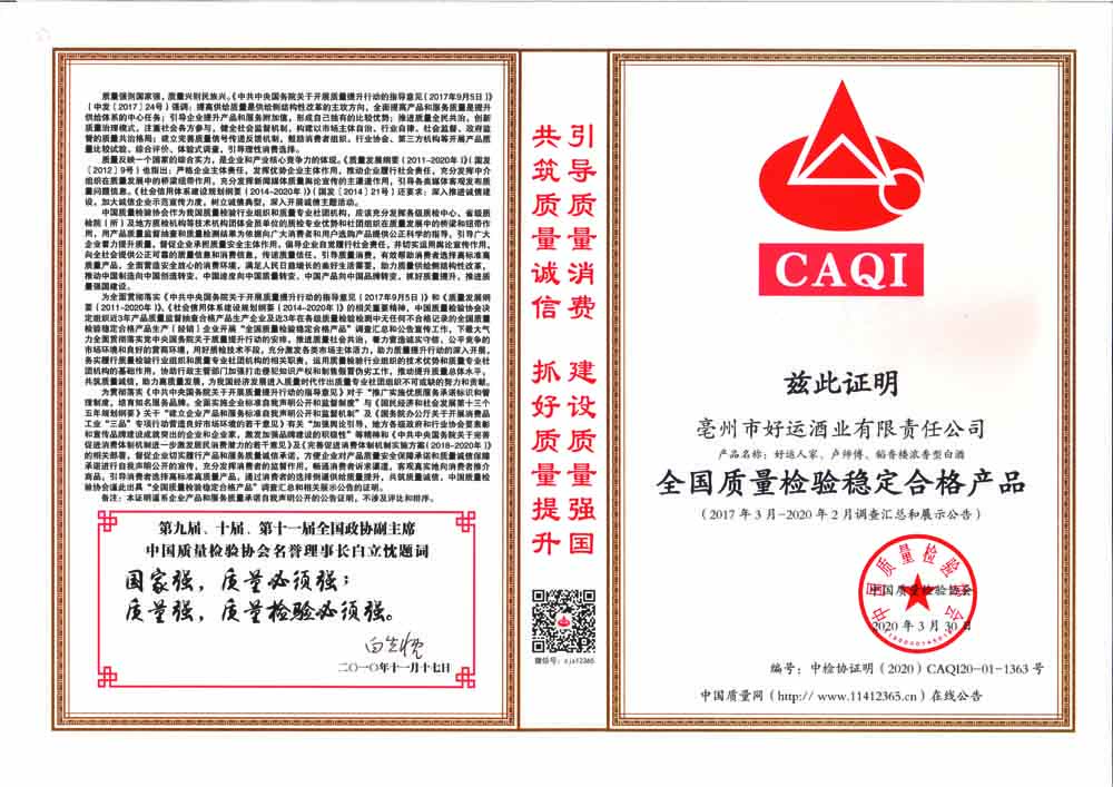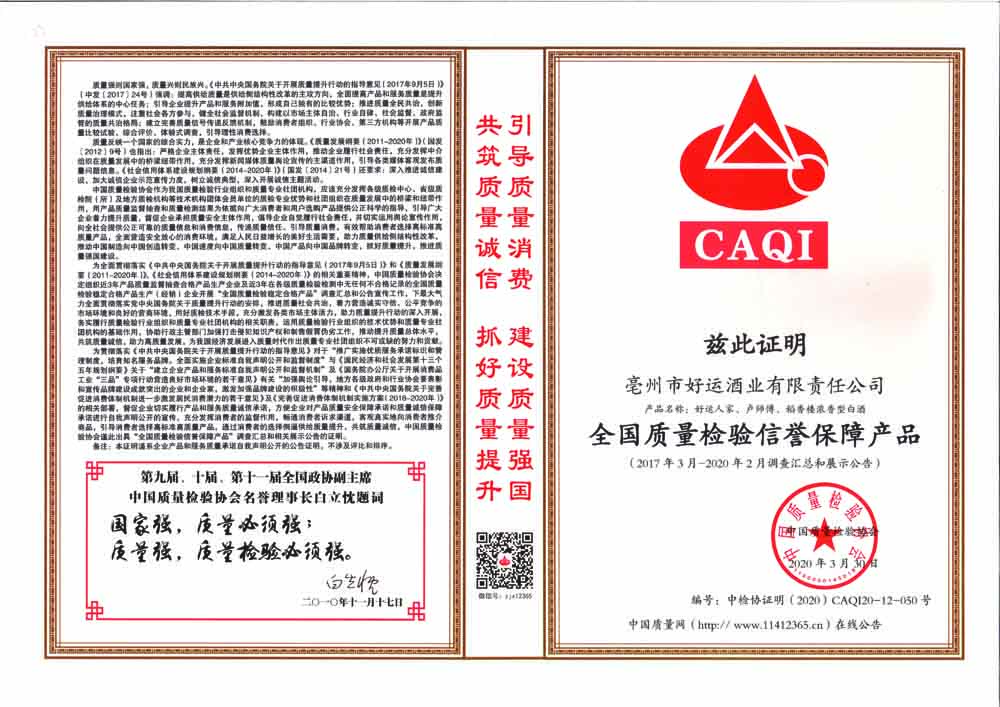 全國白酒行業(yè)質(zhì)量領(lǐng)先品牌
