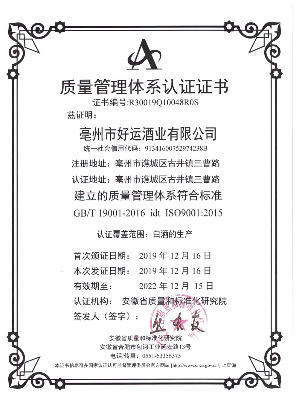 質(zhì)量管理體系認證證書